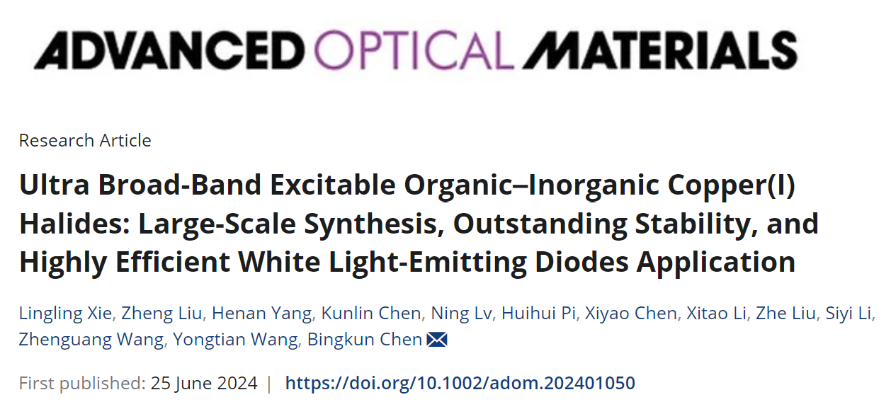 Lingling Xie, Zheng Liu, Henan Yang, Kunlin Chen, Ning Lv, Huihui Pi, Xiyao Chen, Xitao Li, Zhe Liu, Siyi Li, Zhenguang Wang, Yongtian Wang, and Bingkun Chen*. Ultra Broad-Band Excitable Organic-Inorganic Copper(I) Halides: Large-Scale Synthesis, Outstanding Stability, and Highly Efficient White Light-Emitting Diodes Application. Adv. Optical. Mater. 2024, 2401050.