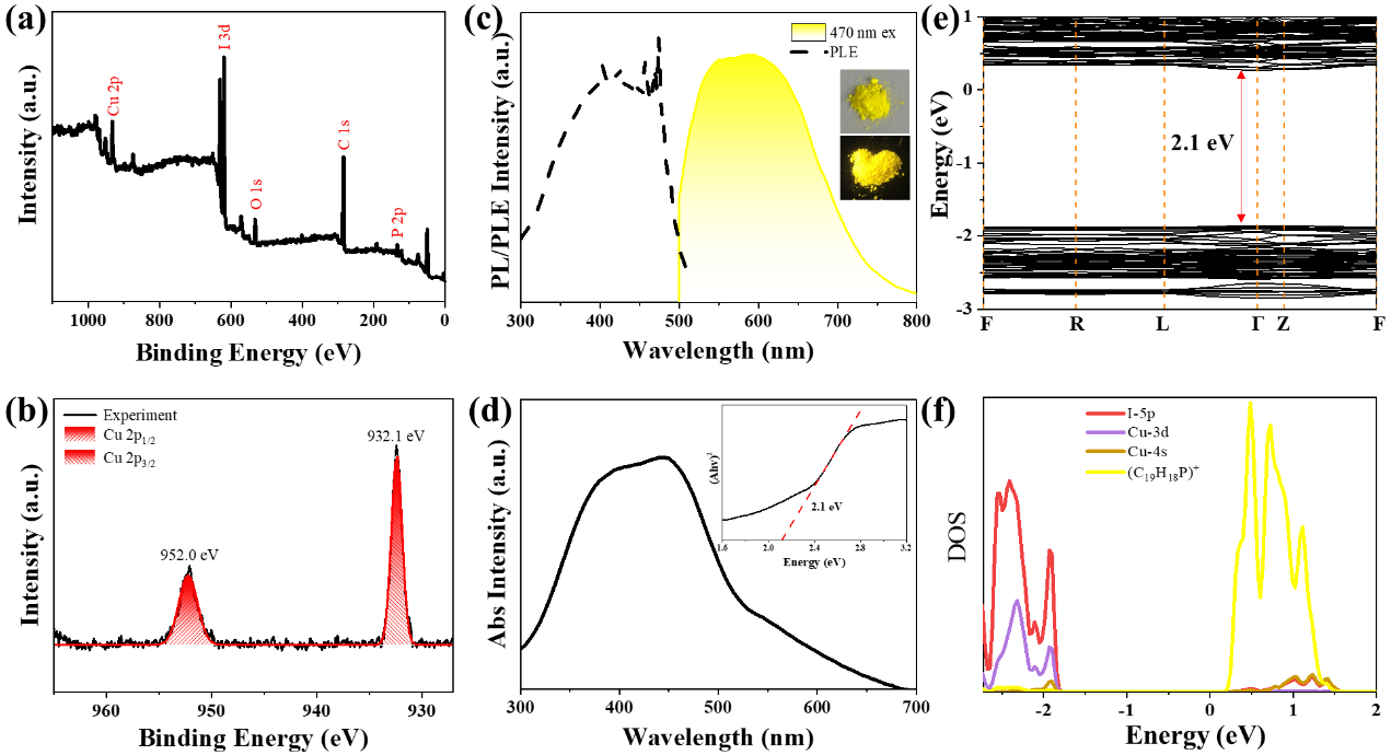 (C19H18P)2Cu4I6具有超宽激发光谱,横跨300-500 nm,在365 nm紫外光激发下为黄光发射。其荧光光谱由不明显的双峰构成,半峰宽为180 nm,PLQY高达87.4%。光学性质与理论计算结果相结合,证实其发光来源于金属-配体电荷转移(MLCT)或卤素-配体电荷转移(HLCT)激发态和簇中心(CC)激发态的协同作用。