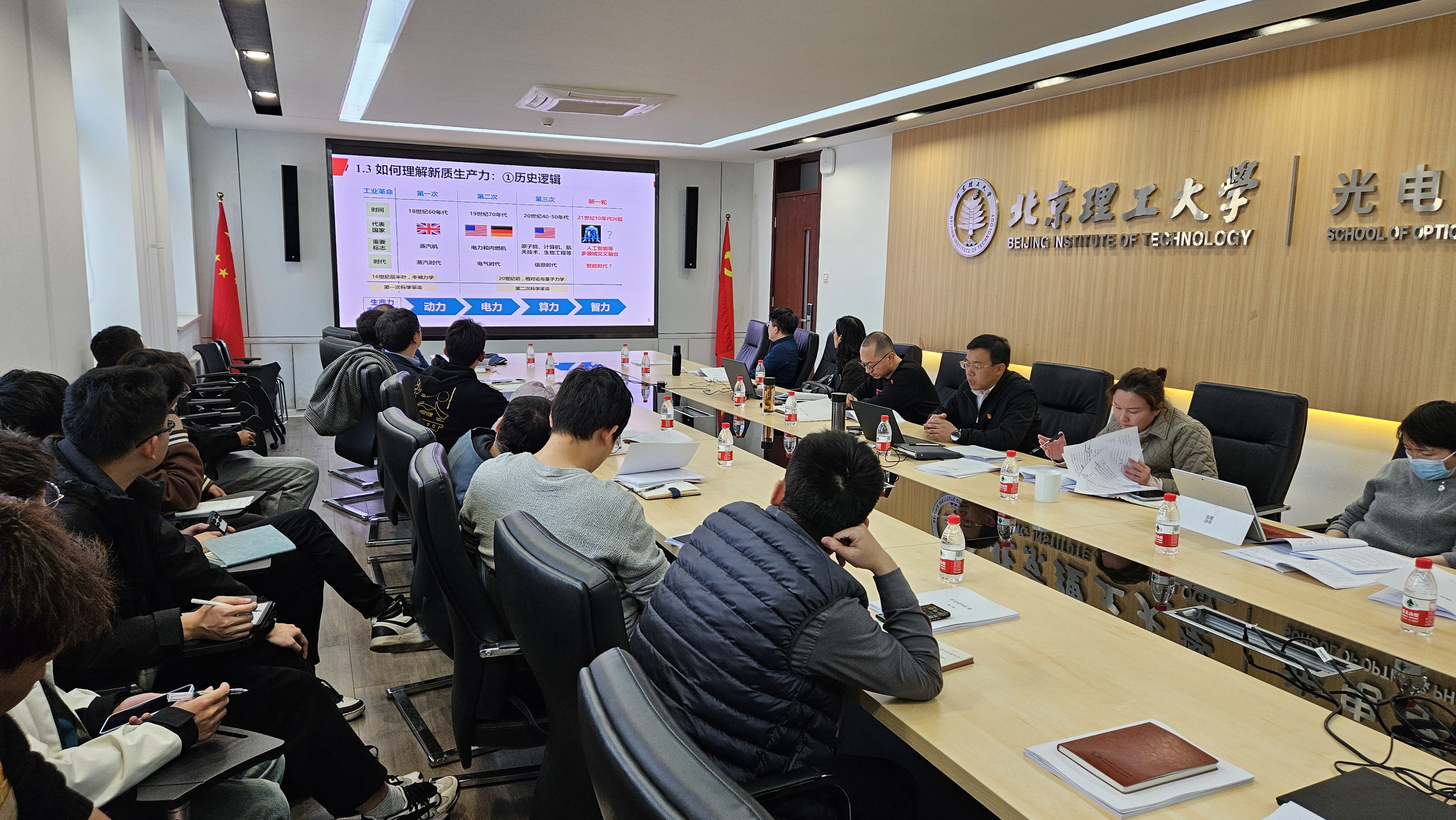 学院党委理论学习中心组成员、固定列席人员,各教工党支部书记、学生党支书记代表参加学习,学院党委书记董立泉主持学习。董立泉结合校党委宣传部下发的《师生理论学习指南》“两会学习”专刊和学院党委《学习资料汇编第二期(2024)》等学习材料,围绕全国两会期间习近平总书记重要讲话精神,以及习近平总书记关于发展新质生产力、推动高质量发展的重要论述等进行了领学,重点宣讲解读了张军书记在校党委理论中心组扩大学习的发言PPT《加快发展新质生产力 谱写北理工高质量发展新篇章》。