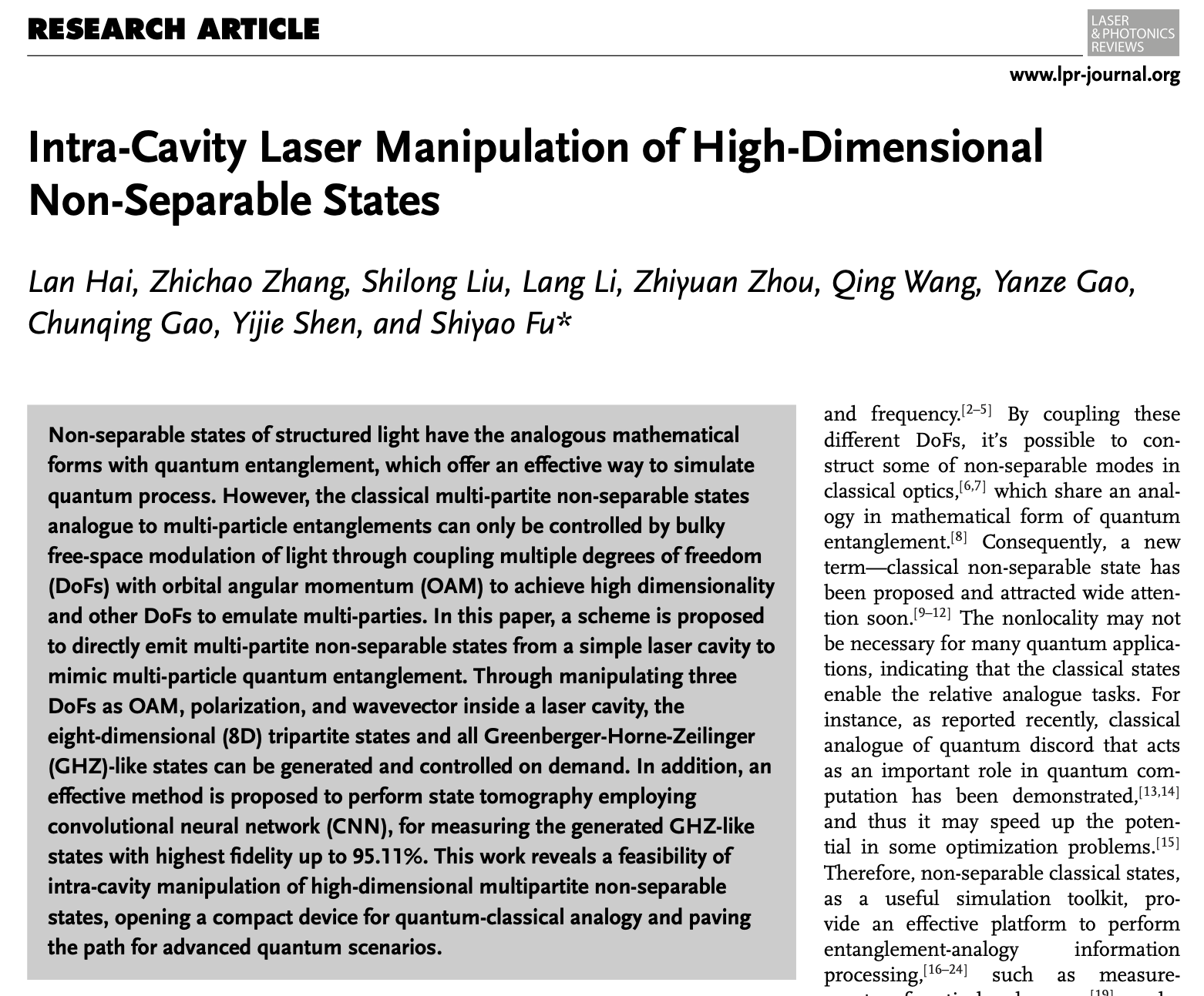近日,taptap点点体育高春清、付时尧团队联合中国科学技术大学史保森、周志远团队、加拿大蒙特利尔理工学院Shilong Liu博士以及新加坡南洋理工大学Yijie Shen助理教授,在激光谐振腔内光子角动量高维调控研究方面取得显著进展。通过将光子自旋-轨道角动量耦合引入V形激光谐振腔,首次实现了三体八维量子纠缠模拟态,即高维经典不可分离态(Classical non-separable state, CNSS)的激光谐振腔直接输出。该研究成果提供了具有集成性的高维量子态经典模拟源,以"Intra-Cavity Laser Manipulation of High-Dimensional Non-Separable States" 为题发表在光学顶级期刊Laser & Photonics Review(SCI一区,IF:11.0)上。该研究工作得到了国家重点研发计划、国家自然科学基金、北京市自然科学基金、博士后创新人才支持计划等资助。taptap点点体育是唯一第一作者及通讯作者单位,taptap点点体育2021级博士研究生海澜、2022级博士研究生张智超为共同第一作者,付时尧研究员为通讯作者。