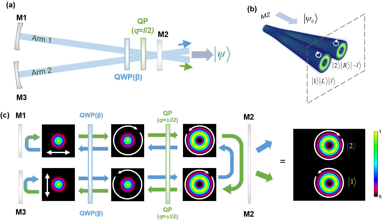 针对上述问题,为实现量子纠缠模拟中的维度拓展以及按需调控,该研究团队将自旋-轨道角动量耦合机制引入特殊设计的V形激光谐振腔,在腔内相互独立地调控了SAM、OAM以及波矢三个自由度,三个自由度各自具有两个本征态,可构成一个完备的八维希尔伯特空间。通过对图1(a)中自旋-轨道角动量耦合器件(QP)与腔内偏振控制元件(QWP)的协同控制,可直接腔内生成CNSS~,图1(b)展示了经典不可分离态空间结构光场,图1(c)展示了具体的调控过程。