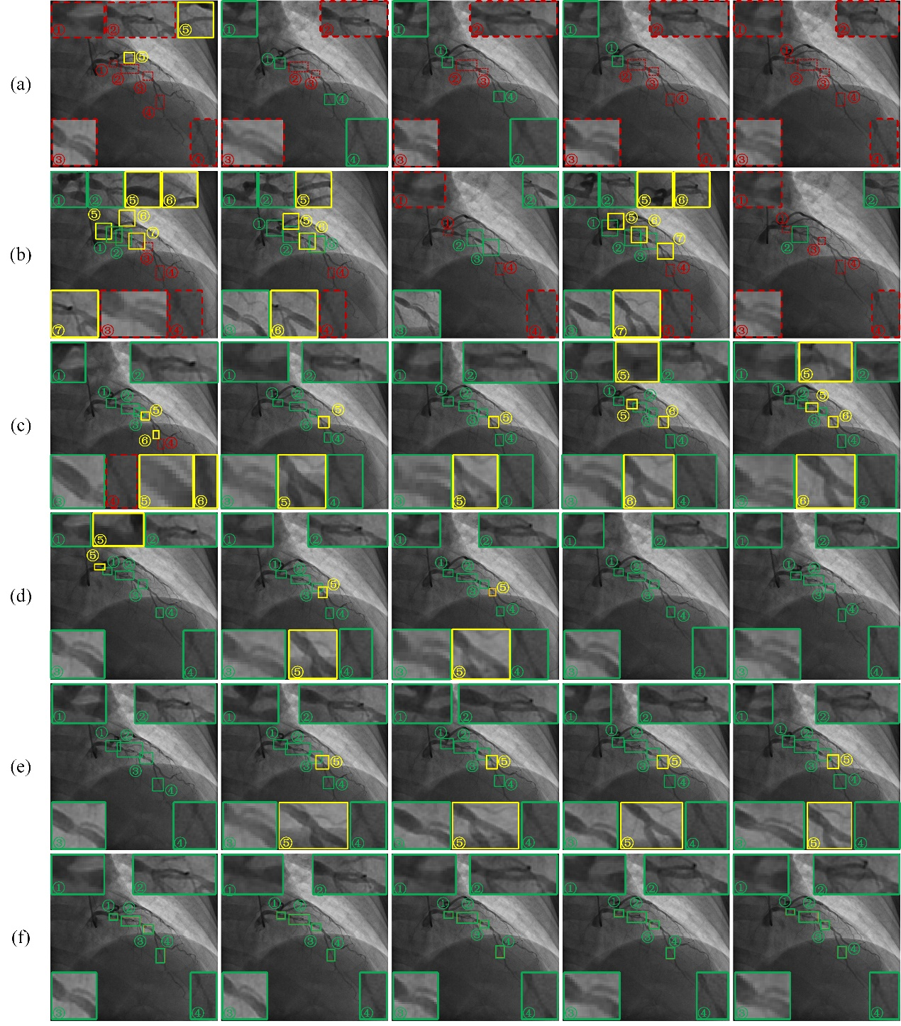 图2 与狭窄检测方法的对比实验结果,其中(f)为所提STQD-Det。