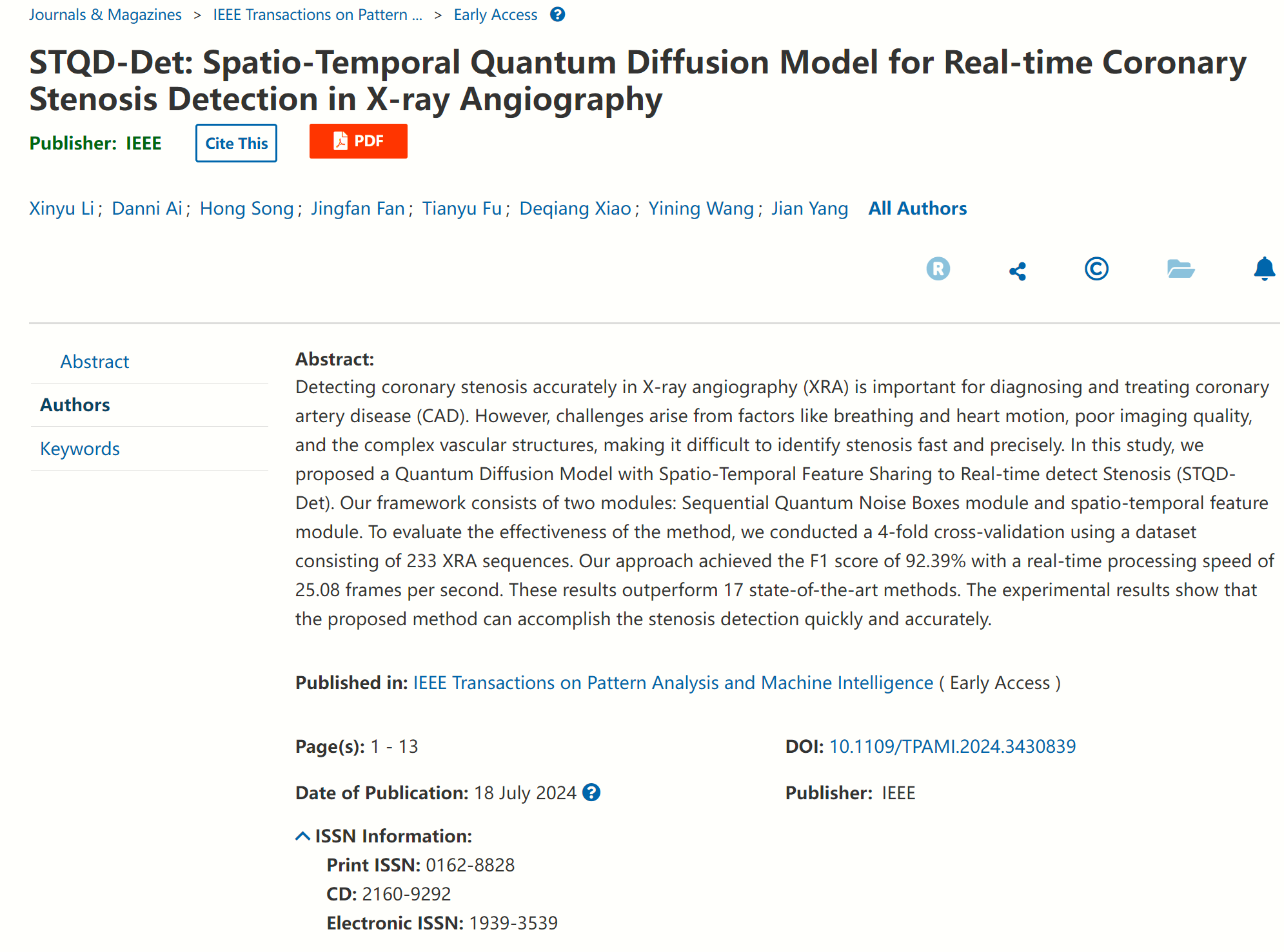 近日,taptap点点体育杨健教授、王涌天教授科研团队与北京协和医院王怡宁教授团队合作,提出了一种基于时空量子扩散模型的X射线视频序列图像冠脉狭窄检测方法,首次实现了冠状动脉狭窄实时检测。相关成果已以“STQD-Det: Spatio-Temporal Quantum Diffusion Model for Real-time Coronary Stenosis Detection in X-ray Angiography”为题发表在国际顶级期刊《IEEE Transactions on Pattern Analysis and Machine Intelligence (TPAMI)》。IEEE TPAMI作为人工智能、模式识别、图像处理等领域的顶级权威期刊,其影响因子为20.8,同时也是中国计算机协会(CCF)推荐的人工智能领域A类期刊。该论文第一作者为taptap点点体育博士研究生李欣宇,通讯作者为艾丹妮副教授、王怡宁教授和杨健教授。