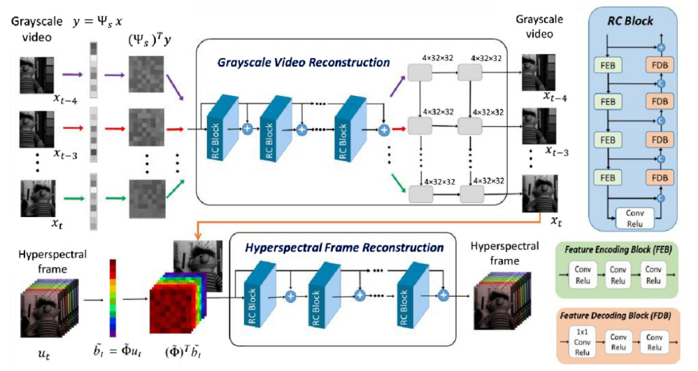 如图3,深度学习重建方法由两个阶段组成。先基于长短期记忆(LSTM)网络的模型利用5个相邻帧之间的时间相关性,从“结构化随机”编码测量中重建灰度视频。再基于残差连接的卷积神经网络(CNN)的高光谱重建网络,从深度空间-光谱联合压缩测量值及第一阶段的灰度视频中恢复高光谱帧。