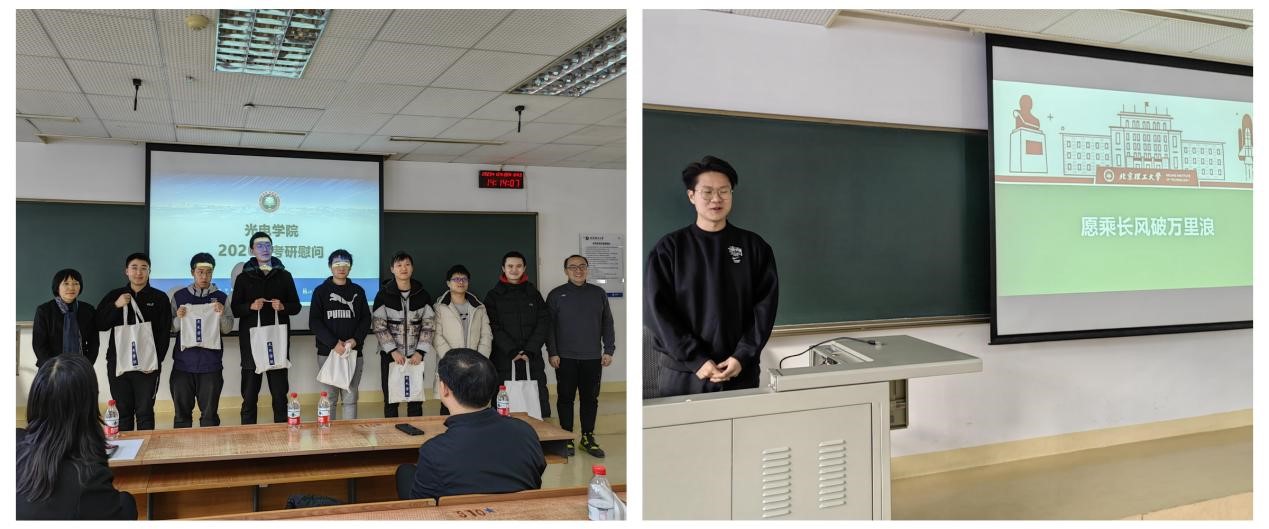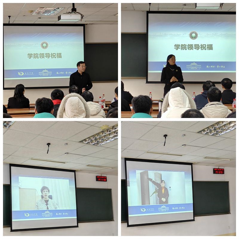 董立泉简要介绍了当前考研形势,并向全体考研学生表达了关切之情,充分肯定了同学们坚守初心、勤学不怠、勇于探索的态度,希望同学们努力克服困难,抓住冲刺阶段的宝贵时间,考出优异成绩。王茜蒨嘱咐同学们,放下包裹,轻装上阵,希望同学们拥有一颗“平常心”,在最后的备考阶段,科学规划,再接再厉,坚持到最后一刻,发挥出最好的状态。家长代表们提到,考研是一场持久战,唯有坚持才能上岸,希望同学们积极调整情绪,最后都能一战上岸。黄一帆和杨亚楠代表学院给考研学生代表发放慰问品。往届考研学生马懿提醒同学们做好考前的准备工作,合理调整作息,以最饱满的精神状态迎接考试。