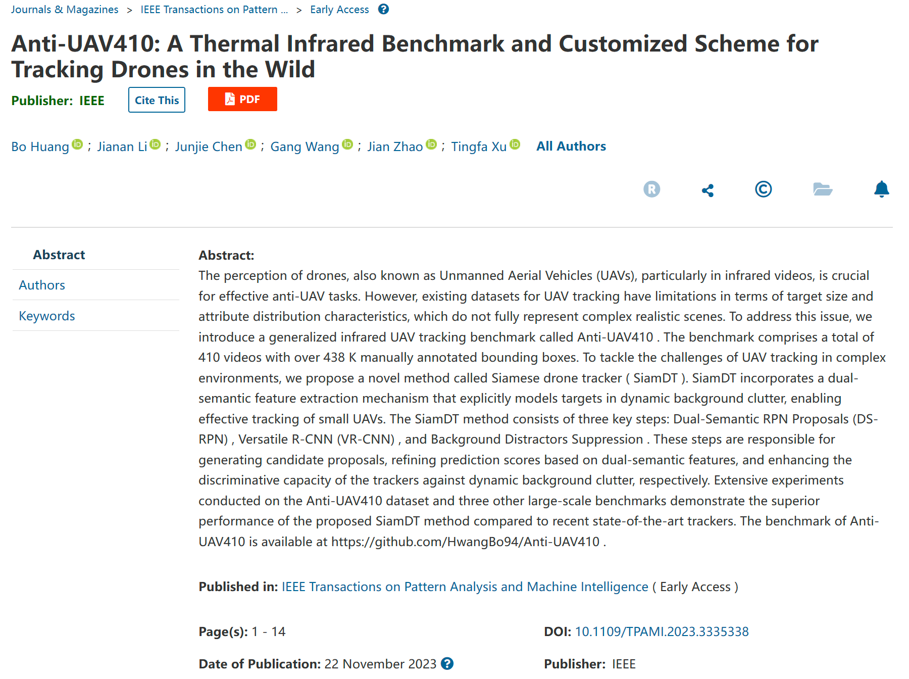 基于红外图像的智能目标探测技术是解决“低慢小”目标定位与跟踪的关键,同时也是国际学术前沿和国家重大工程需求。为了克服在复杂场景下红外小目标探测的难题,taptap点点体育的许廷发教授科研团队进行了智能化红外小目标定位与跟踪方法的研究,取得了突破性进展。该研究成果以“Anti-UAV410: A Thermal Infrared Benchmark and Customized Scheme for Tracking Drones in the Wild”为题,已在国际顶级期刊《IEEE Transactions on Pattern Analysis and Machine Intelligence (TPAMI)》上发表。IEEE TPAMI作为人工智能、模式识别、图像处理等领域的顶级权威期刊,其影响因子为23.6,同时也是中国计算机协会(CCF)推荐的人工智能领域A类期刊。