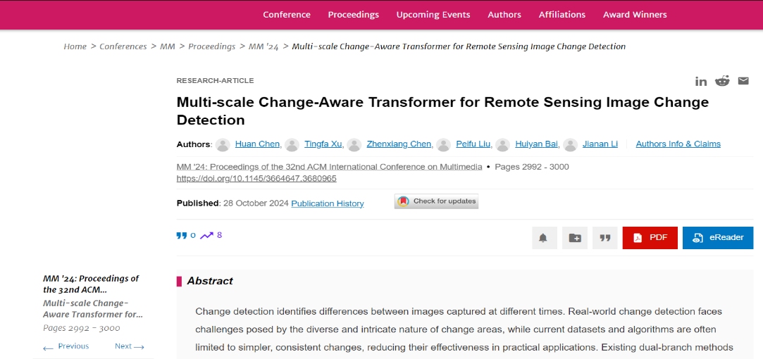 论文详情:Huan Chen, Tingfa Xu, Zhenxiang Chen, Peifu Liu, Huiyan Bai, and Jianan Li. 2024. Multi-scale Change-Aware Transformer for Remote Sensing Image Change Detection. In Proceedings of the 32nd ACM International Conference on Multimedia (MM '24). Association for Computing Machinery, New York, NY, USA, 2992–3000. https://doi.org/10.1145/3664647.3680965