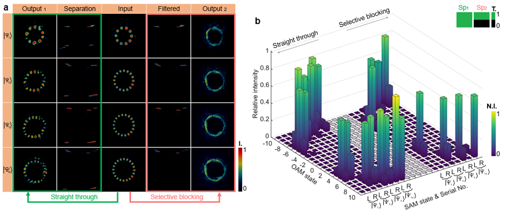 在分离器件的基础上,团队设计了由分离模式向原始光场变换的逆变换器件,进而通过级联分离器件与逆变换器件以类4-f滤波的形式实现了对光子TAM的按需滤波调控,如图2所示。