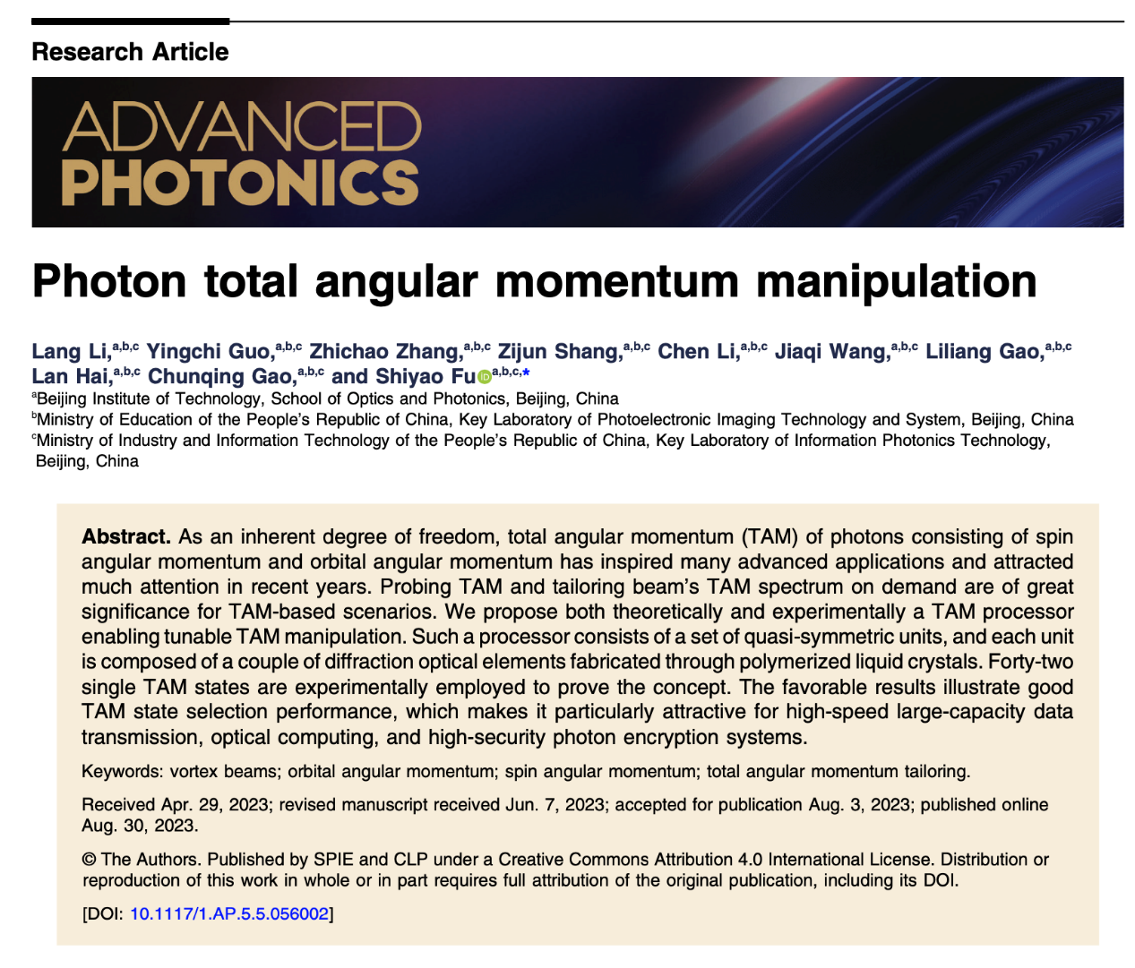 北理工高春清、付时尧团队在光子角动量调控研究方面取得重要突破