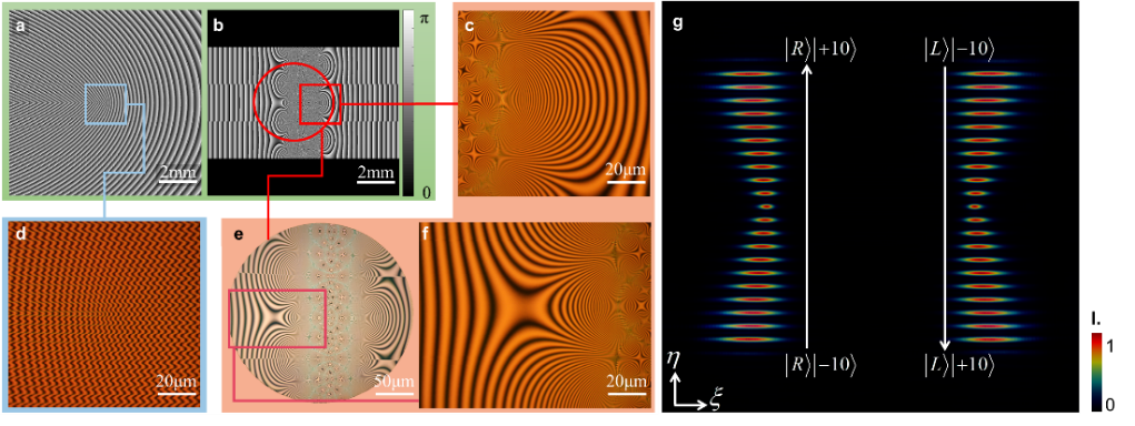 针对上述问题,为实现大范围高精度的光子TAM模式识别及按需调控,该团队将波前复制引入光学空间坐标变换,结合光子自旋霍尔效应,设计并制备了高精度光子TAM态分离器件,如图1(a~f)所示。实现了多达42个光子TAM态的高精度分离,不同TAM态的光子分布于分离平面的特定区域,即可通过图像处理等手段实现光子TAM态的识别与TAM谱测量,如图1(g)所示。