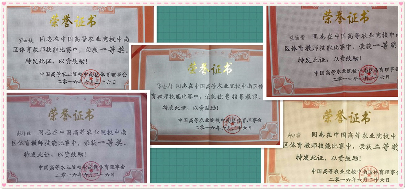 2016年6月25日-26日,由中国高等农业院校中南区体育理事会主办的中国高等农业院校中南区体育教师技能比赛在河南信阳农林学院进行,共有SUNBET申搏、华南农业大学、华中农业大学等11所高校106名教师参加比赛。SUNBET体育部教师罗海蛟、张海雷、彭祚琼分别荣获足球、篮球、排球项目一等奖,邱庆堂荣获篮球项目二等奖,罗远标主任荣获优秀指导教师奖,为SUNBET争得了荣誉。