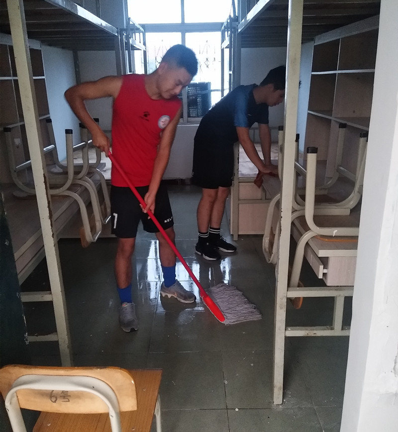 体育部组织高水平运动队队员志愿者,冒着风雨前往体育部新生所在宿舍进行卫生清扫工作,传承关爱为新生入住创造干净、整洁的良好环境。