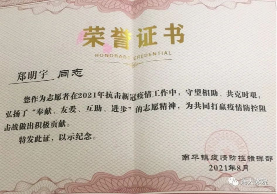 8月11日起,2019级休闲体育二班郑明宇同学于湖北省荆州市公安县开展防疫宣传活动,主要形式为:巡逻、开宣传车提醒村民们不要扎堆、外出佩戴口罩,搬运防疫物资等。因防疫宣传活动中的突出表现,南平镇疫情防控指挥部为他颁发了志愿服务荣誉证书,鼓励其为打赢疫情防控阻击战做出的积极贡献,与市民守望相助,共克时艰,弘扬了“奉献、友爱、互助、进步”的志愿精神。