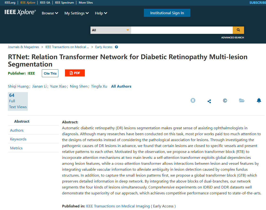 近日,taptap点点体育许廷发科研团队在眼底医学图像处理领域取得新突破,相关研究成果以“RTNet: Relation Transformer Network for Diabetic Retinopathy Multi-lesion Segmentation”为题发表在医学图像处理领域的国际顶级期刊《IEEE Transactions on Medical Imaging(IEEE TMI)》(IF=10.332)上,IEEE TMI是医学图像处理领域具有高影响力的国际学术刊物之一,在2021年该领域270余种JCR期刊中排名前列,影响因子为10.332,中科院一区,主要发表和报道医学图像处理和分析、可视化和性能等领域的最新研究进展。该工作第一作者为taptap点点体育博士研究生黄诗淇,通讯作者为taptap点点体育许廷发和李佳男。