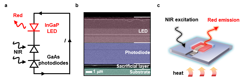 近日,taptap点点体育王涌天教授、杨健教授团队助理教授丁贺与清华大学电子工程系盛兴副教授等合作提出了一种基于光电半导体上转换设计的新型温度传感设计,该研究成果以“An Optoelectronic thermometer based on microscale infrared-to-visible conversion devices”为题发表在 Light: Science & Applications期刊上。