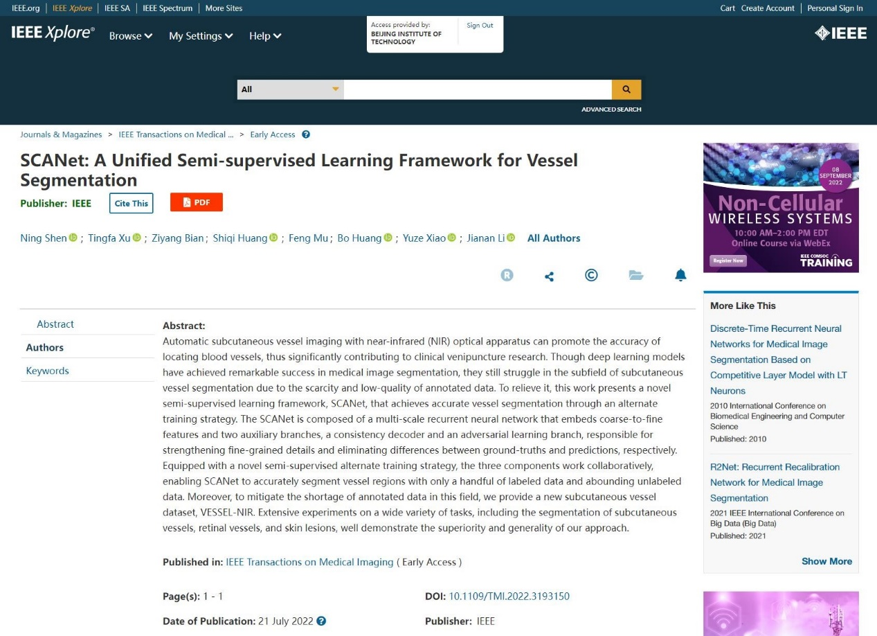 近日,taptap点点体育许廷发教授科研团队在红外静脉血管医学图像处理领域取得新突破,相关研究成果以“SCANet: A Unified Semi-supervised Learning Framework for Vessel Segmentation”为题发表在医学图像处理领域的国际顶级期刊IEEE Transactions on Medical Imaging(IEEE TMI,IF=11.037)。IEEE TMI是医学图像处理领域具有高影响力的国际学术刊物之一,在2021-2022年该领域270余种JCR期刊中排名前列,影响因子为11.037,中科院一区,主要发表和报道医学图像处理和分析、可视化和性能等领域的最新原创研究成果。该工作第一作者为taptap点点体育博士研究生沈宁,通讯作者为taptap点点体育李佳男特别副研究员和许廷发教授。